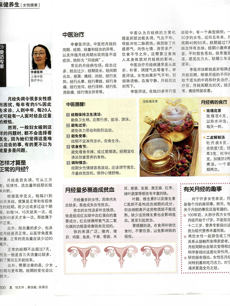 Dr Li Rui points out that TCM treats excessive menstrual flow by regulating the Liver, nourishing Blood, strengthening the Spleen, tonifying the Kidneys, and regulating the Chong and Ren meridians. In clinical practice, acupuncture, herbal conditioning, and lifestyle adjustments are combined to achieve the goals of regulating menstruation, stopping bleeding, and enhancing the body's constitution.